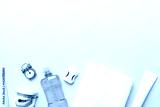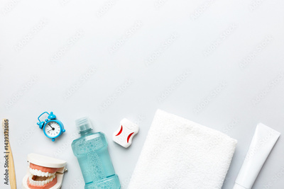 Mouthwash and other oral hygiene products on colored table top view with copy space. Flat lay. Dental hygiene. Oral care products and space for text on light background. concept