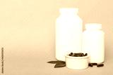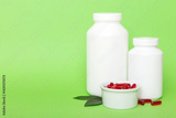 different drugs and health supplement pills with medicine bottle health care and medical top view. Vitamin tablets. Bottle with colored pills on table background. Multivitamins