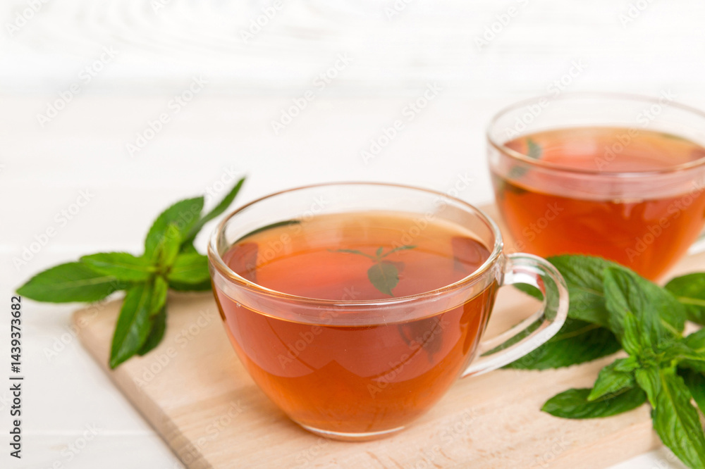 Cup of mint tea on table background. Green tea with fresh mint top view with copy space