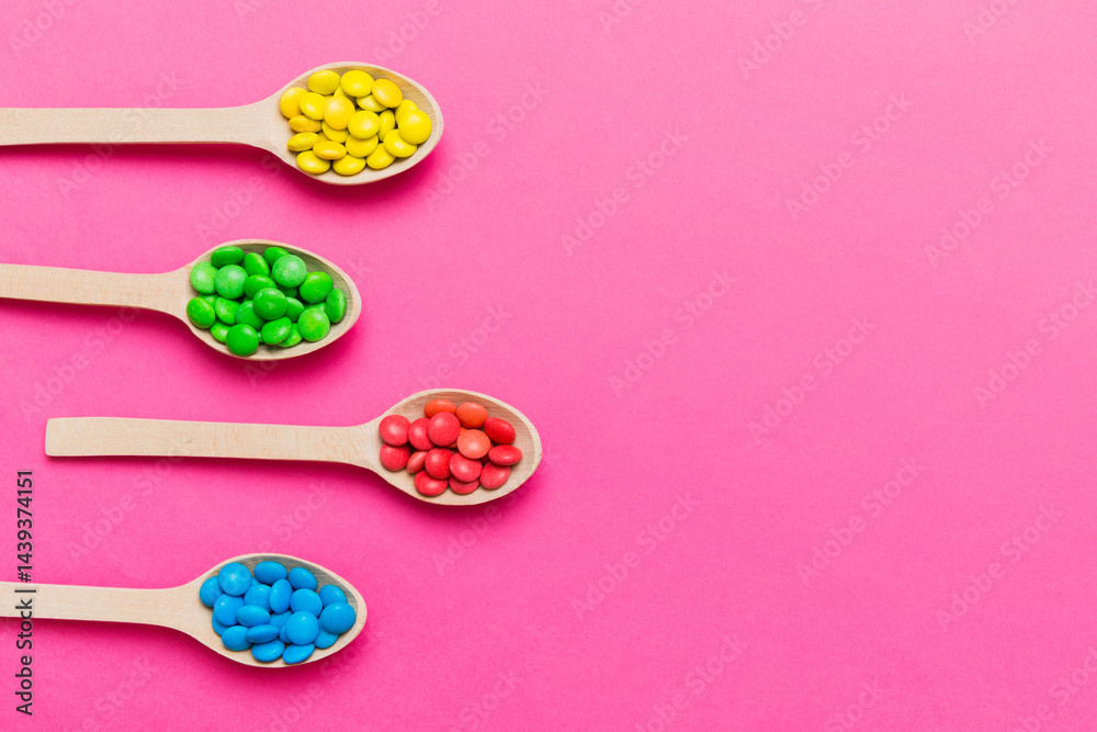 delicious colorful sweet candies on spoon on colored background . Confectionery decor top view with copy space
