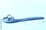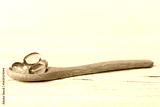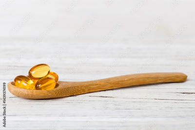 Vitamin omega capsules in a spoon on a colored background. Pills served as a healthy meal. Red soft gel vitamin supplement capsules on spoon