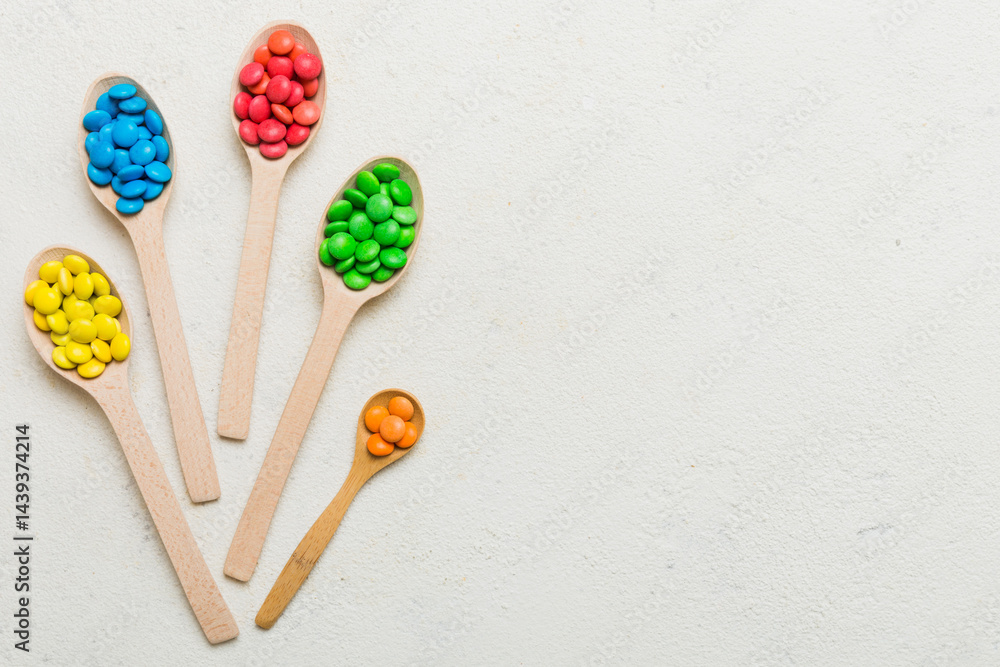 delicious colorful sweet candies on spoon on colored background . Confectionery decor top view with copy space