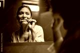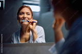 Smiling woman brushing teeth before bedtime while looking herself in mirror.