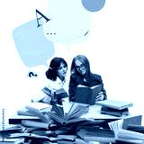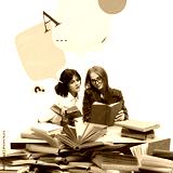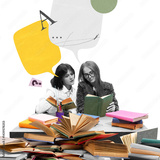 Two female students reading colorful books with creative speech bubbles flying around. Exam preparation, homework. Contemporary art collage. Concept of education, collaboration, creativity