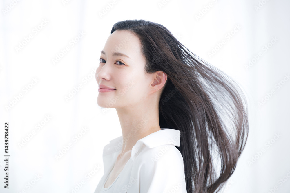 Beauty image of a young woman's long flowing black hair hair care and beauty Beauty image of a young woman's long flowing black hair care and beauty Woman fluttering in the wind