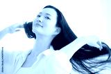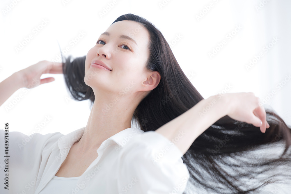 若い女性の流れる長い黒髪のヘアケアや美容のビューティーイメージ 髪の毛をかき上げる
