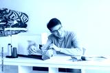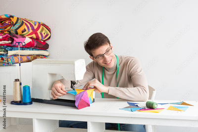 quilting at the workshop of tailor male - smiling tailor with glasses and measuring tape on the neck works on the sewing machine with brightly colored patchwork and looking to the side. Sewing concept