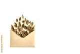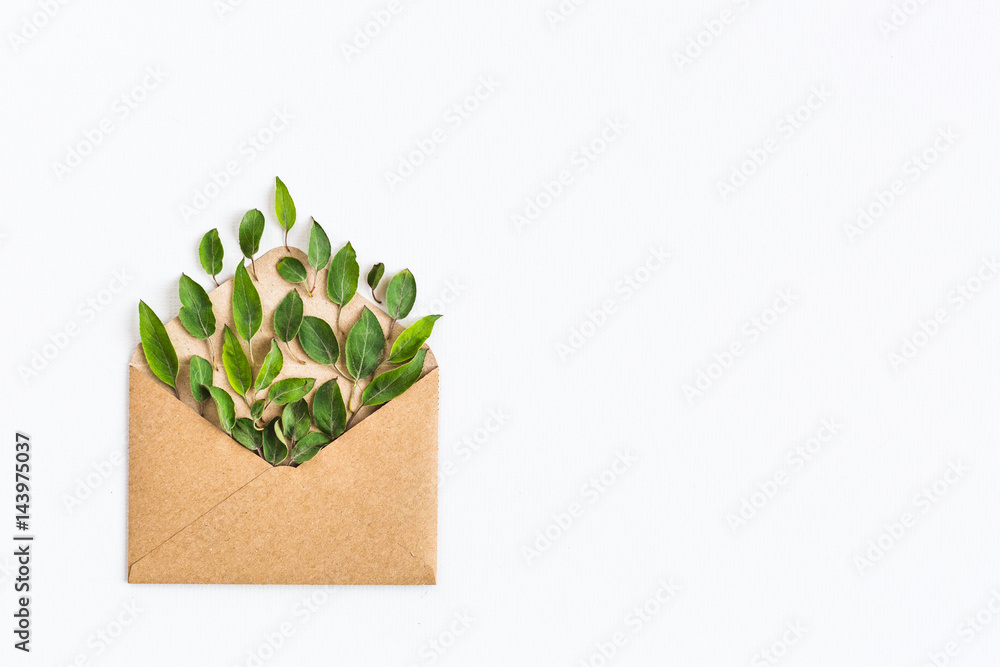 opened craft paper envelope filled with green leavess on white background. healthy lifestyle offer. Care about environment. Recycling and using trees and nature resources concept. Fresh concept.