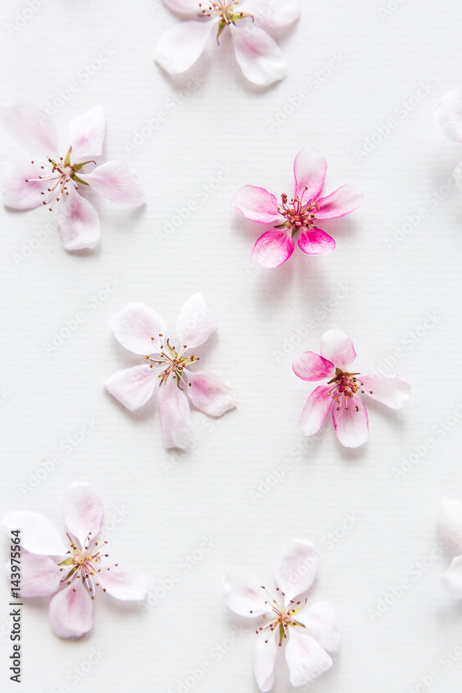 close up of light and soft sakura flower and green leaves behind on white background. Concept of love. feeling of spring. Dof on sacura flower. top view. Flat lay.