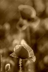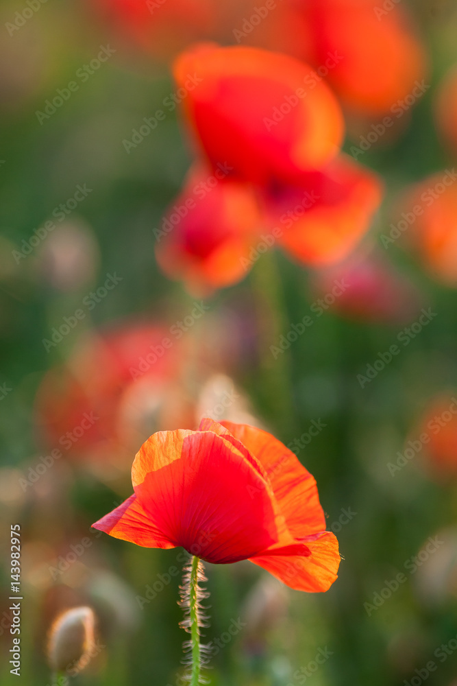 Nature, spring, blooming flowers concept - close-up of red poppies over green and red background vertical