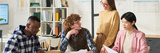 Group of diverse students engaging in collaborative study session for foreign languages, with one teacher overseeing. Classroom is equipped with books and educational materials