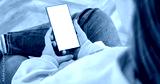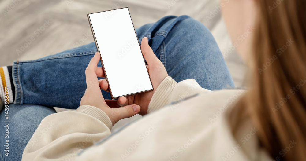 Casual young or teenage woman using smartphone and browsing websites and enjoying peaceful moment in warm home. Modern lifestyle, digital convenience, technology concept. Blank screen and copy space.