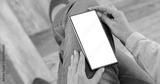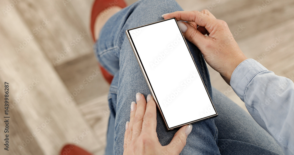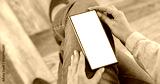 Woman browsing the internet and online stores and shopping on her smartphone, sitting comfortably in a warm cozy home setting. Blank copy space for text, advertising, app design or promotional mockup.