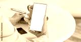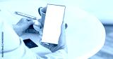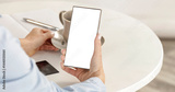 Female hands holding blank screen mobile phone on white desk with credit card, coffee and pen. Empty display, screen ready for branding. Modern technology, online activities and shopping concept.