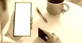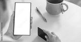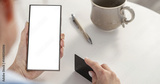 Female hands holding blank screen mobile phone and credit card on white desk with coffee and pen. Empty display, screen ready for branding. Modern technology, online activities and shopping concept.