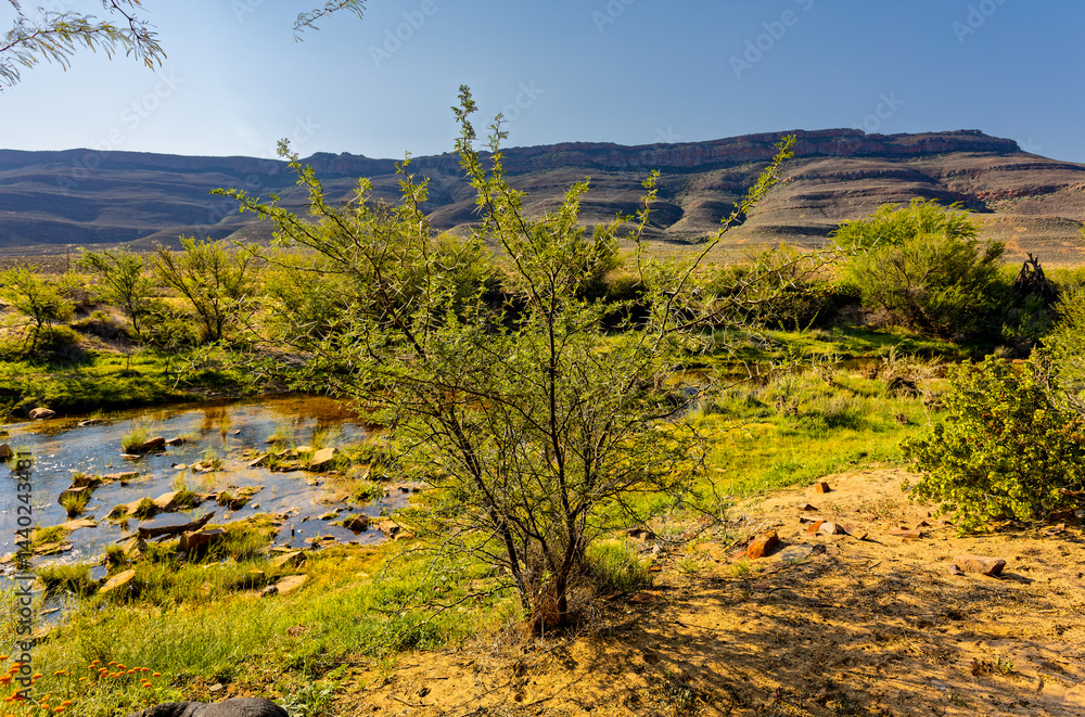 Small acacia thorn tree next to the Biedouw River with mountains in the background in the northern Cederberg in the Western Cape South Africa