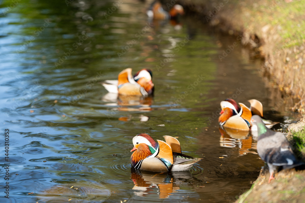 Many beautiful male mandarin duck swimming in the lake. Close-up photo. Nature and wild birds