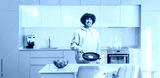 Guy in a kitchen frying an egg