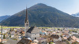 Aerial winter view of the city centre of Imst in Tirol. Beautiful city view with Tschirgant mountain in the background and Pfarrkirche Imst in foreground. Tourist travel destination in Tyrol, Austria.