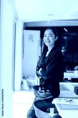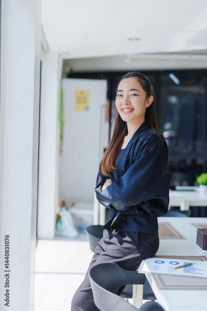 Portrait of a smiling young Asia businesswoman with arms crossed sitting on a desk in a modern office
