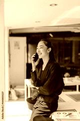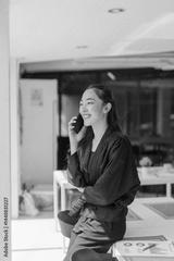Young Asian manager enjoying a cheerful phone conversation during a break in a bright, modern office filled with natural light