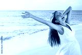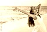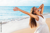 Freedom woman on beach enjoying life with open arms feeling free bliss and success on beach. Happiness Asian girl in white summer dress enjoying ocean nature sunset during travel holidays vacation.