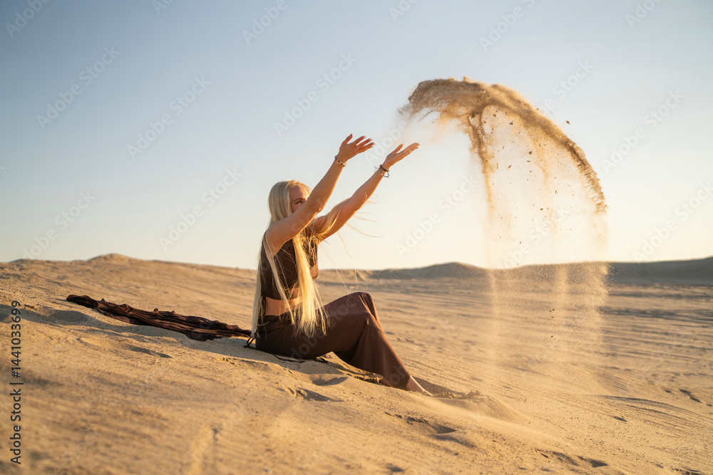 Woman kneels with arms raised, throwing sand into the golden sunset, creating a beautiful silhouette against the glowing horizon.