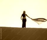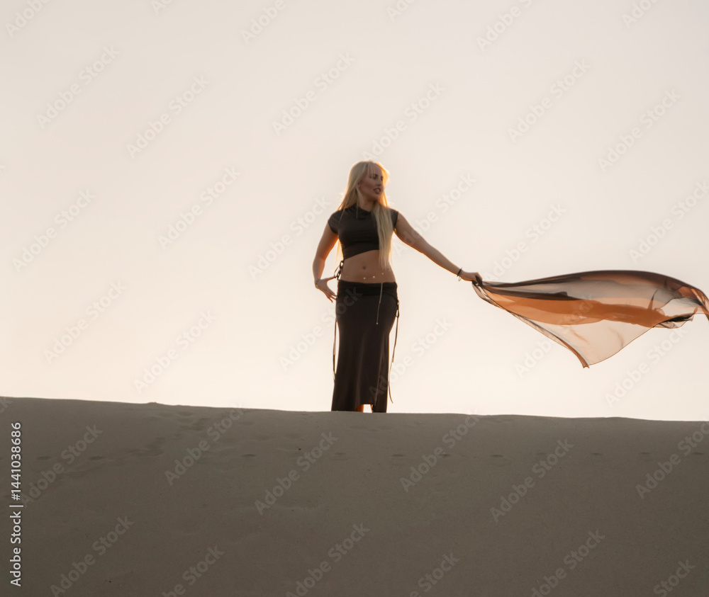A woman stands joyfully on top of a sand dune, embracing the serene atmosphere in desert during sunset against a clear sky.