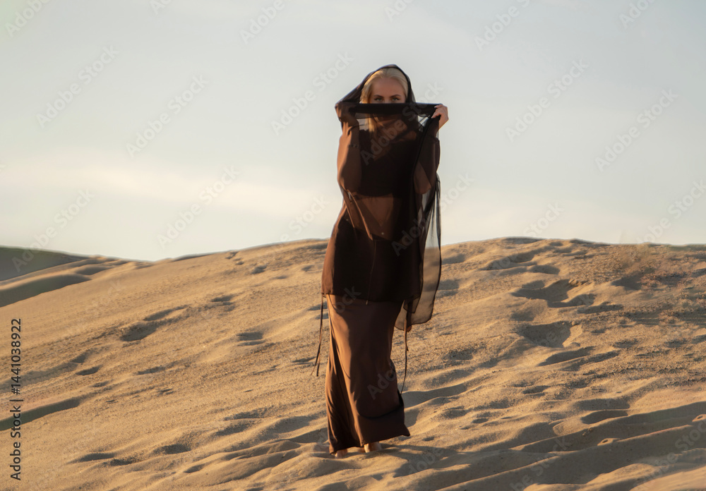 Woman Wearing Hijab Stands in Desert at Sunset, Showcasing Beauty and Resilience Against the Arid Landscape