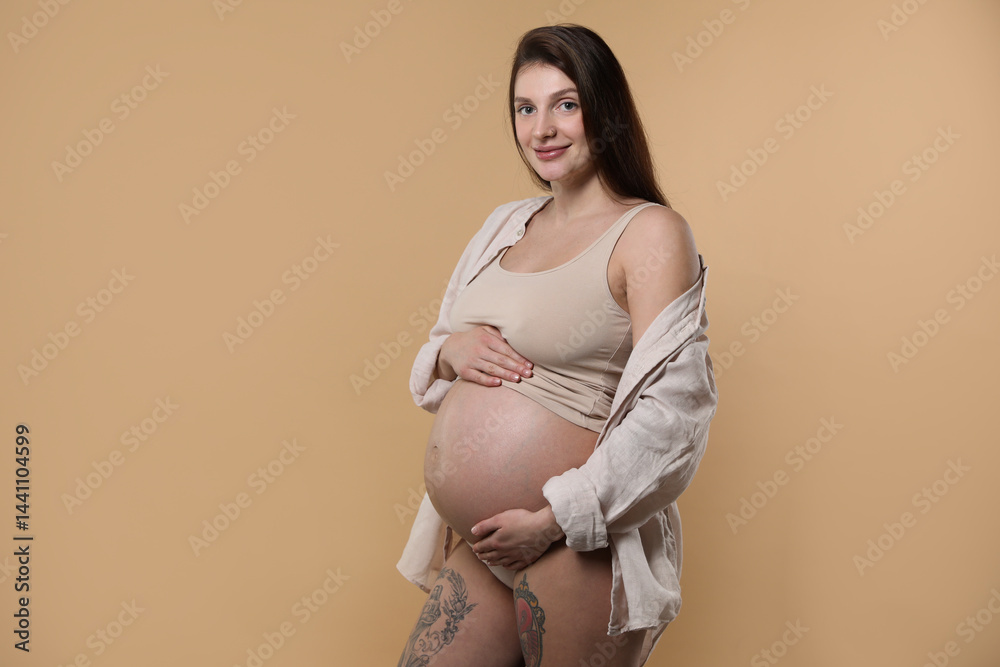 Beautiful pregnant woman with cute belly on beige background. Space for text