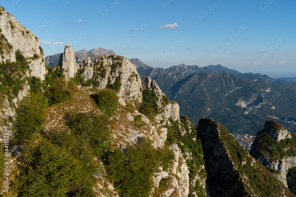 Panoramic view of lakes and surrounding mountains near Belvedere del Parco Valentino at Piani Resinelli, Valsassina, Italy. Aerial view of province of Lecco, near Monte Coltignone and Cima Paradiso