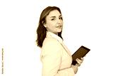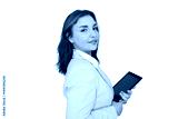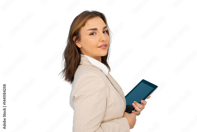 Confident businesswoman holding digital tablet looking over shoulder on transparent background