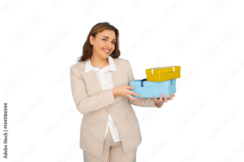 Studio shot of a businesswoman holding two gift boxes, isolated on transparent background