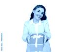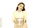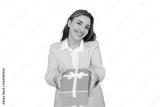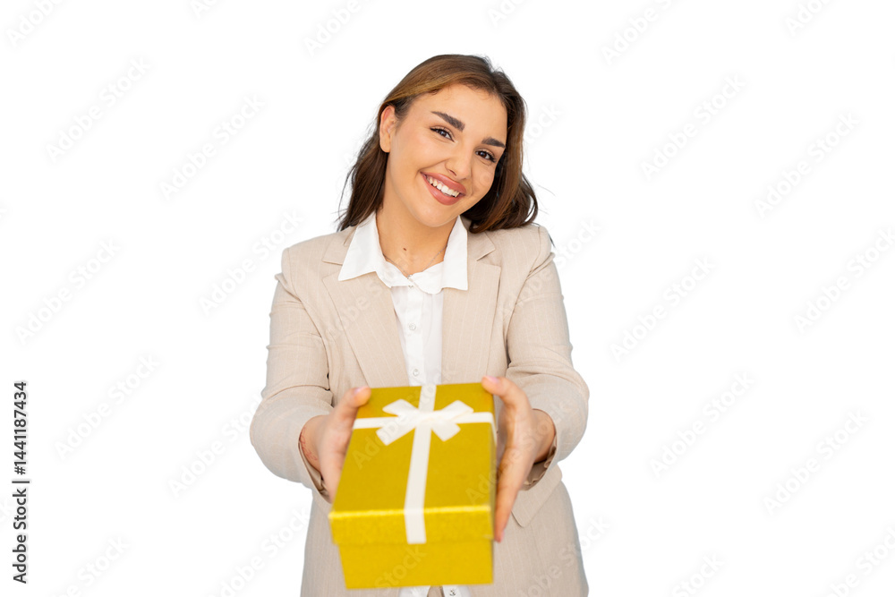 Happy businesswoman offering golden gift box with white ribbon, isolated on transparent background