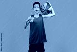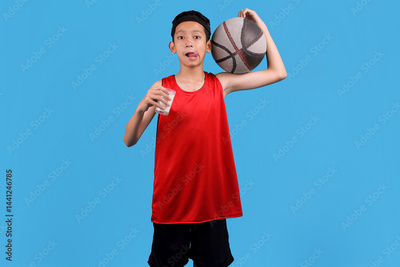 Healthy Asian boy proudly holding milk and basketball in vibrant studio portrait.