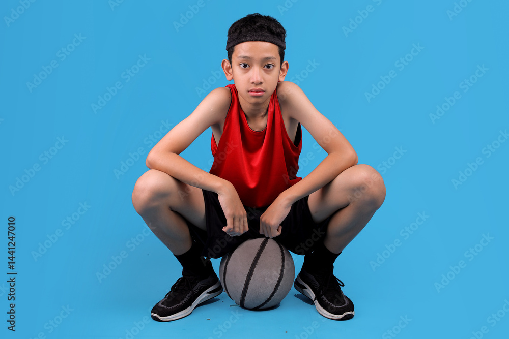 Confident boy player in red jersey sitting down on the ball after practice