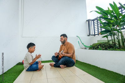 Father Playing Ukulele With Son At Home Terrace