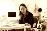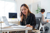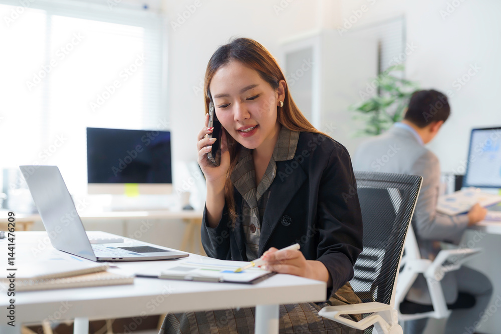 Young businesswoman analyzing financial charts while engaging in a conversation on her smartphone in a modern office environment
