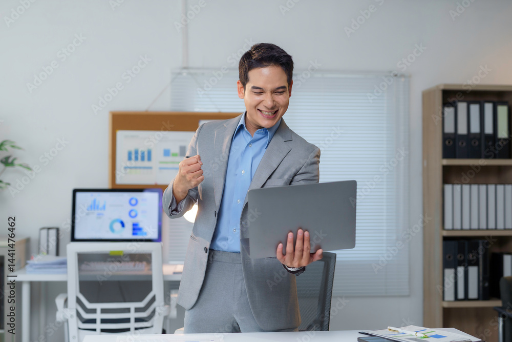 Happy businessman expressing excitement and joy while holding a laptop, celebrating a successful business achievement in a modern office