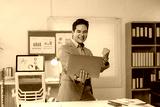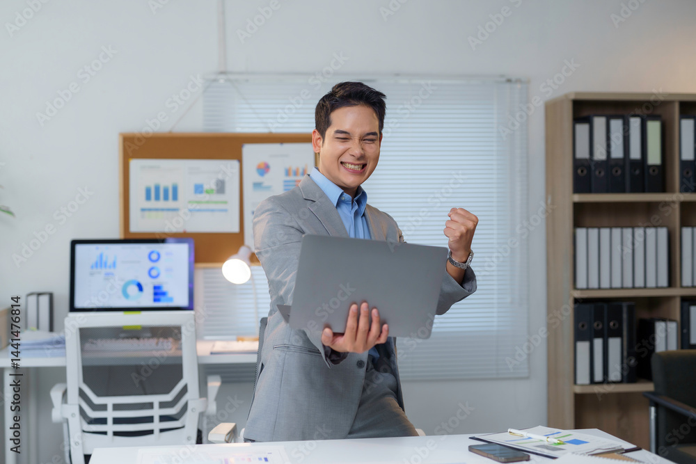 Young businessman is raising his fist and holding a laptop, celebrating a successful project or good news in his modern office