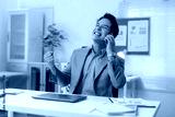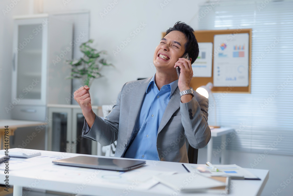 Happy manager receiving great news on a phone call while sitting at his desk in a modern office, celebrating success