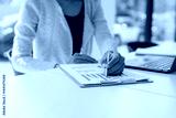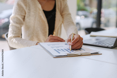 Businesswoman pointing at financial charts and graphs with pen while working on clipboard at office desk with laptop