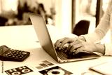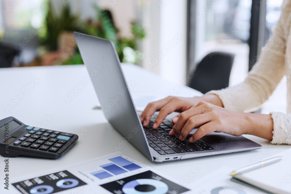 Businesswoman analyzing financial charts and typing on laptop keyboard, working with calculator and business documents in modern office