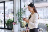 Smiling businesswoman using a smartphone while standing in a bright, modern office space filled with natural light and greenery