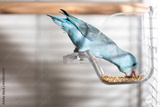 Blue Forpus parrot eating mixed seeds from transparent feeder inside a home birdcage,cute little parrot eating seeds diet in a bowl,organic bird food,bird feeding moment,animal care,pet and lifestyle