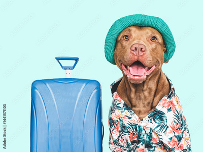 Cute, stylish dog, sun hat and travel suitcase. Dog smile. Travel preparation and planning. Closeup, indoor. Studio shot, isolated background. Vacation, travel and tourism concept. Pets care