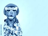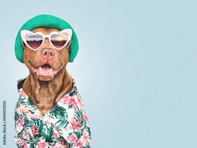 Cute, stylish dog, sunglasses, sunhat and bright shirt. Dog smiling. Travel preparation and planning. Closeup, indoor. Studio shot, isolated background. Vacation, travel and tourism concept. Pets care