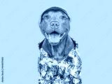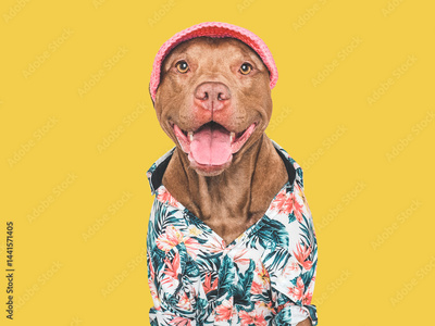 Cute, stylish dog, sun hat and bright shirt. Dog smile. Travel preparation and planning. Closeup, indoor. Studio shot, isolated background. Vacation, travel and tourism concept. Pets care