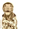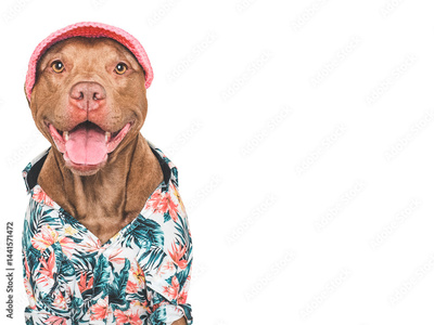 Cute, stylish dog, sun hat and bright shirt. Dog smile. Travel preparation and planning. Closeup, indoor. Studio shot, isolated background. Vacation, travel and tourism concept. Pets care