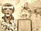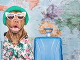 Cute, stylish dog, sunglasses and travel suitcase. Dog smile. Travel preparation and planning. Closeup, indoor. Studio shot, isolated background. Vacation, travel and tourism concept. Pets care